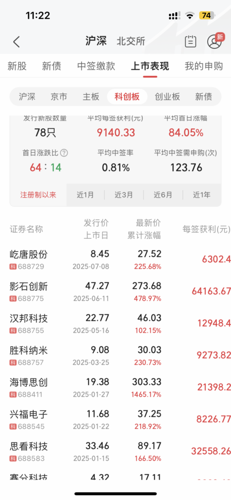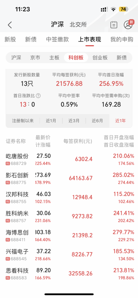 最近一年的话,科创板新上市的13都是首日涨的,平均的首日涨幅256%。很客观啊。