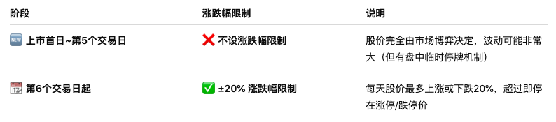 再看下,科创板的涨跌幅限制。在上市的前5日,是不设置涨跌幅限制的。从第6天开始,每天的股票最多上涨或者下跌20%。