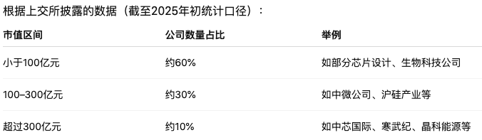 于是咱来看看科创板的公司的市值分布情况。绝大部分的公司的市值那都是在300亿元以下的。像5000亿元的寒王、1万多亿的中芯国际,这样的巨无霸,在科创板里面还是凤毛麟角的。