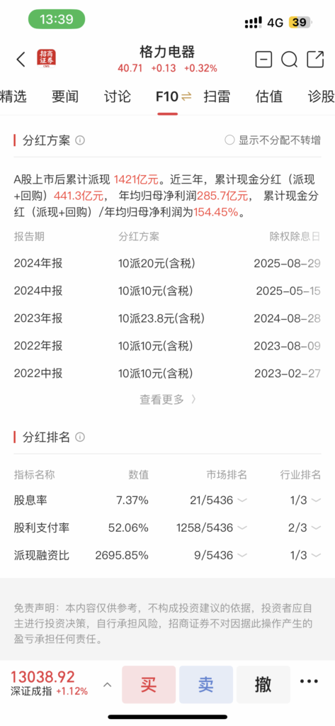 于是,去搜索了一下深市的红利典型,发现有格力、美的这样的。这样的名企分红竟也很大方,完全不输银行股。之后要好好研究一下啊。